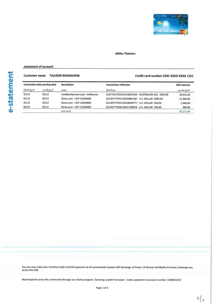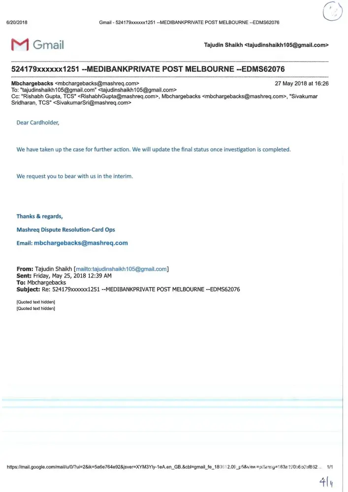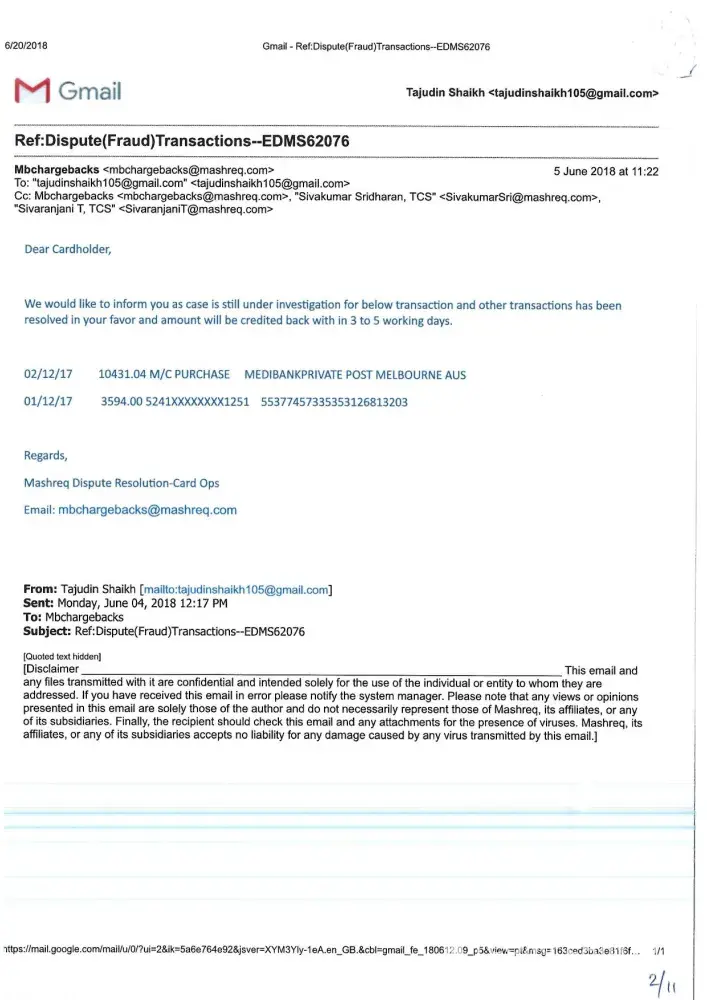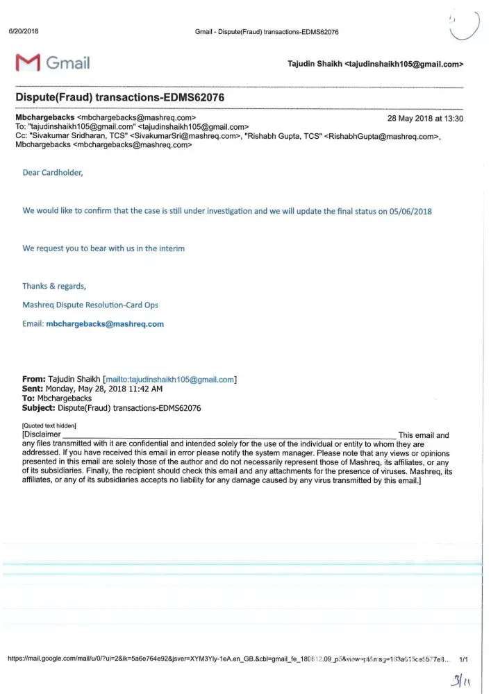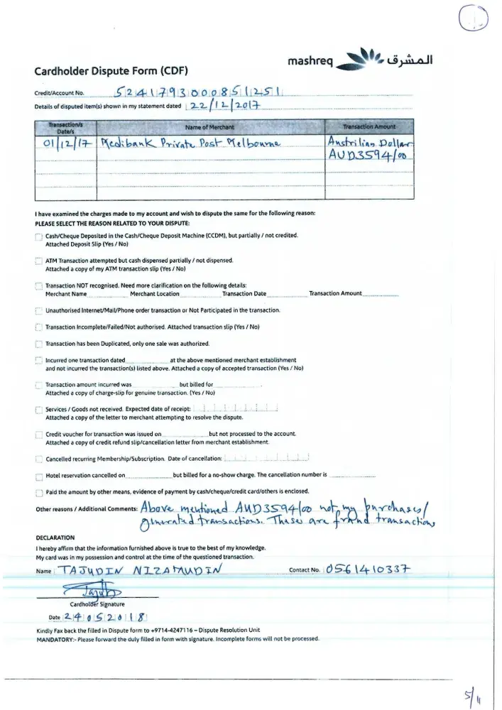 Mashreq Bank Unauthorised credit card charges