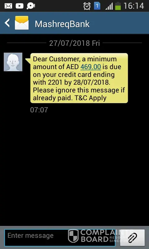 I received a message in my mobile no: [protected] dated on 27/07/2018 stating that minimum amount of AED 469.00 is due on credit card ending with 2201 by 28/07/2018.