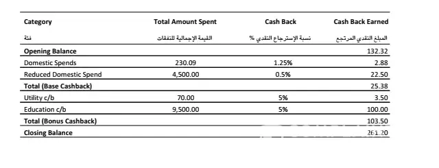 This time I got the monthly e-statement which shows credit card cash back points against the purchase I have made from Mashreq merchant partner which shows eligibility for 5% cashback also mentioned in the statements but in reality, I got only 1.05 % cashback of total amount.