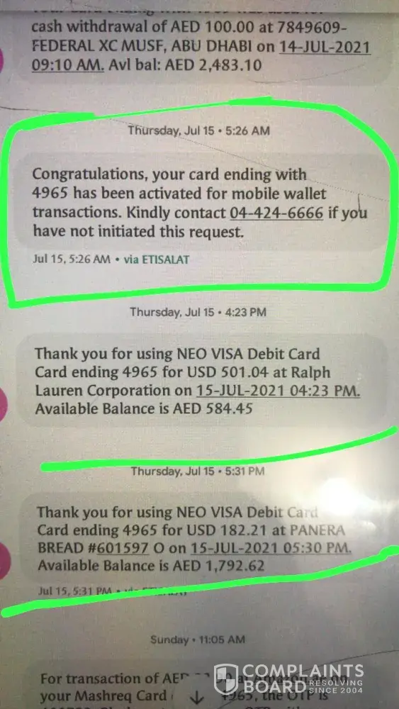 In15th july I received a message from mashreq which is - (congratulations, your card ending with 4965 has been activated for mobile wallet transaction.) but I didn't apply for any kinde of mobile wallet and after that in evening I receive my another message from mashreq amount was debited for USD 501.04 & 182.21