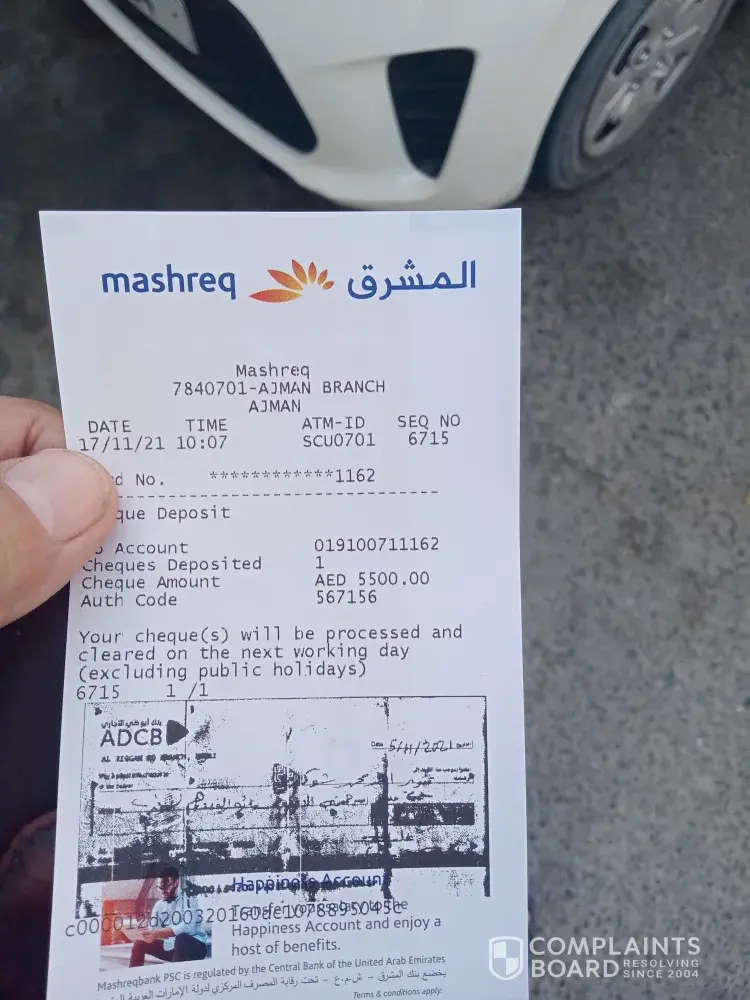 Hi my name Tanveer Ahmed I have mashrik neo account [protected] this month 17 of November I deposit one cheque amount of 5500 Adcb bank but this amount not transfer in my account as per I got massage that it will be in one working day several time I complaint to find my cheque but nobody answered me where this cheque go still today I was waiting but when I call to customer center they also not have any option where I can go for this matter please check regarding cheque where is it now either this will be cash in my account or I can get back
