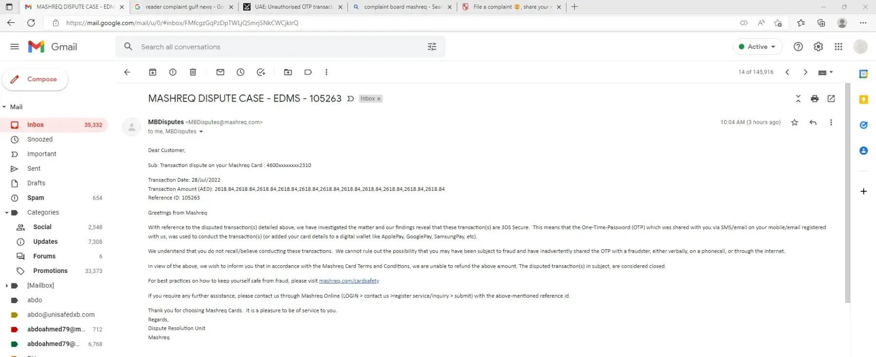 Since then, I have visited the Abu Dhabi branch for follow up and several call-to-call centre follow-up and the answer is the dispute is under investigation and once investigation finishes, they will inform me.