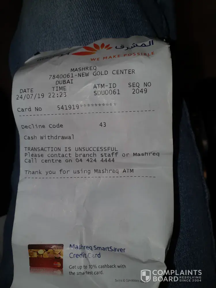 I have a registered complaint on Mashreq Customer Care ( REF-3954349-Z8Q4W2 ). But the issue is not resolved yet.