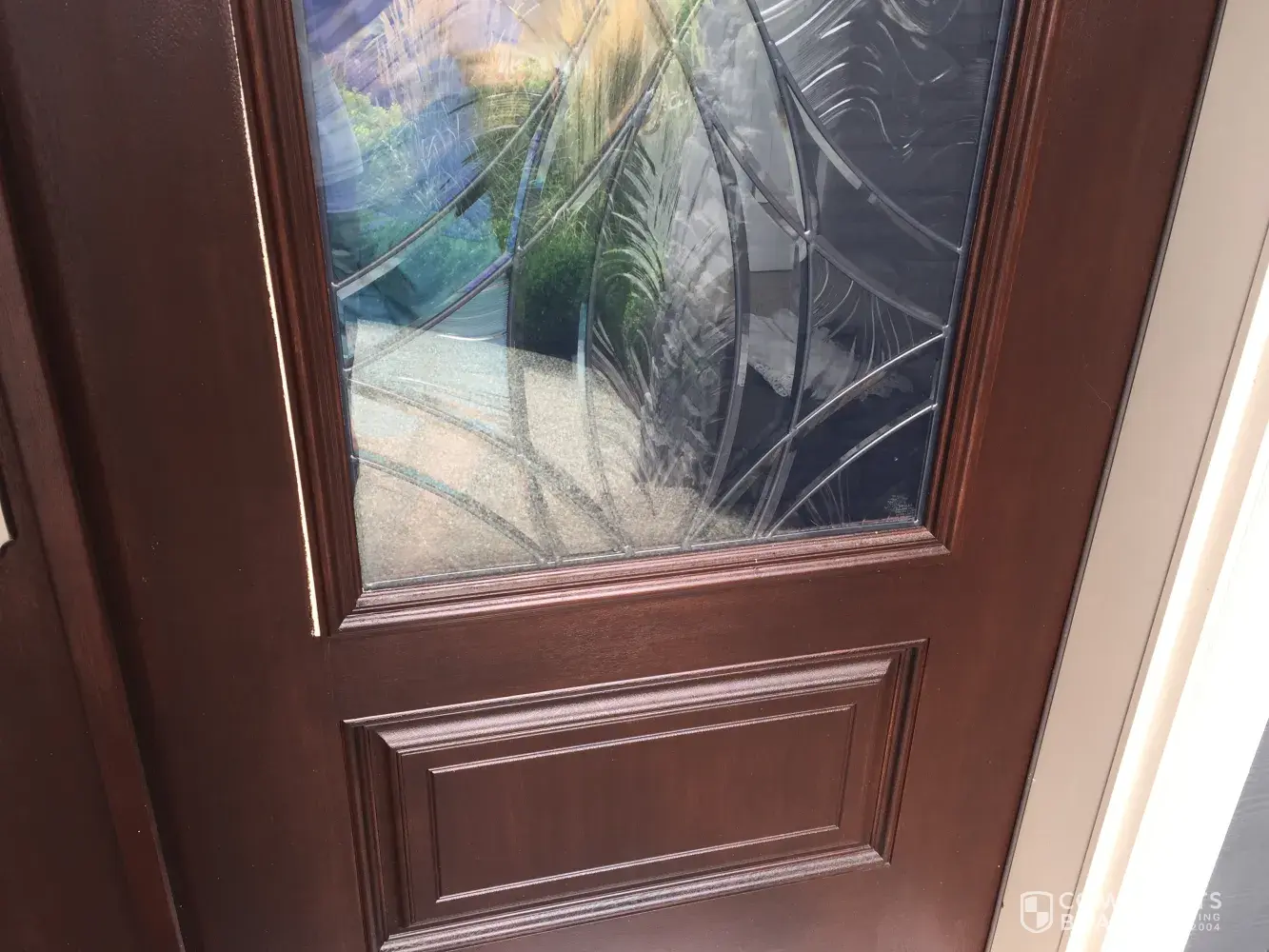 Double fibreglass entry doors were purchased from Masonite and stained by a local refinisher. Within a year the glass insert shifted in both doors which exposed fibreglass that had not been stained. This makes these expensive doors look terrible. Glue is also seeping out onto the glass. I am embarrassed when people come to our house.