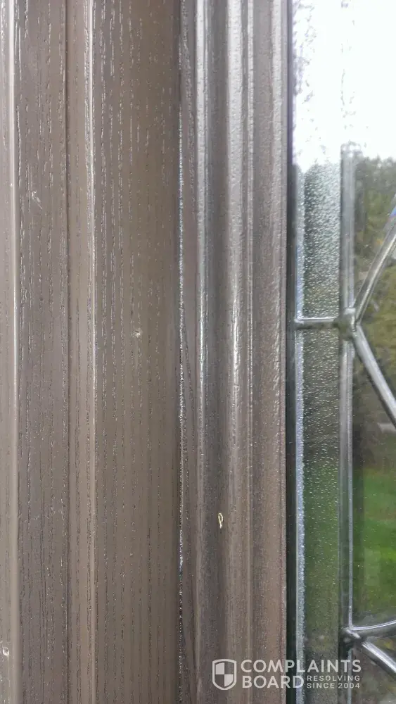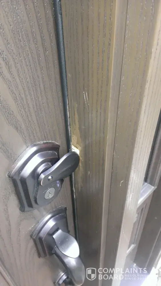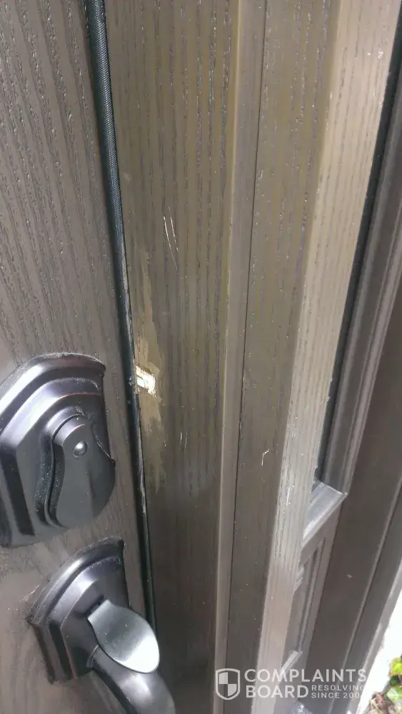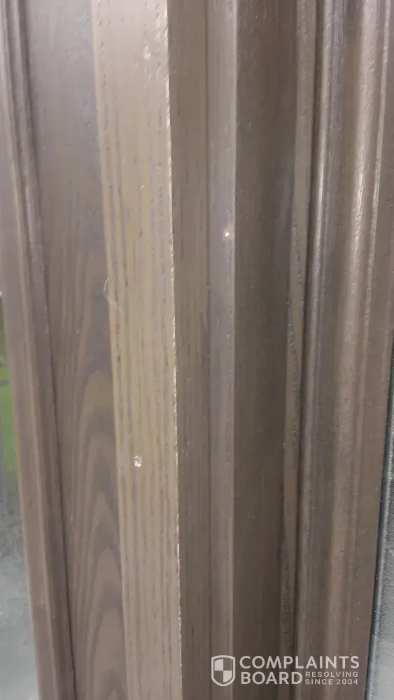 I'm having two problems with my Masonite door. 1. there appears to be adhesive creeping out from around the window and 2. there seems to be a "chalky" substance that randomly appears on top of the paint. The chalky stuff wipes off, but it comes back in about a week and makes the door look "comoflauged" from a distance. The customer is unimpressed... Masonite customer service has yet to even respond to my concerns.