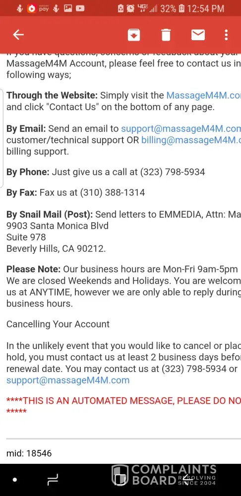 Massagem4m.com closed, telephone numbers disconnected, email accounts closed, they I have a prepaid 12 month contract with them and i got only 6 months of service they are no where to be reached for a refund! Emails get bounced back.