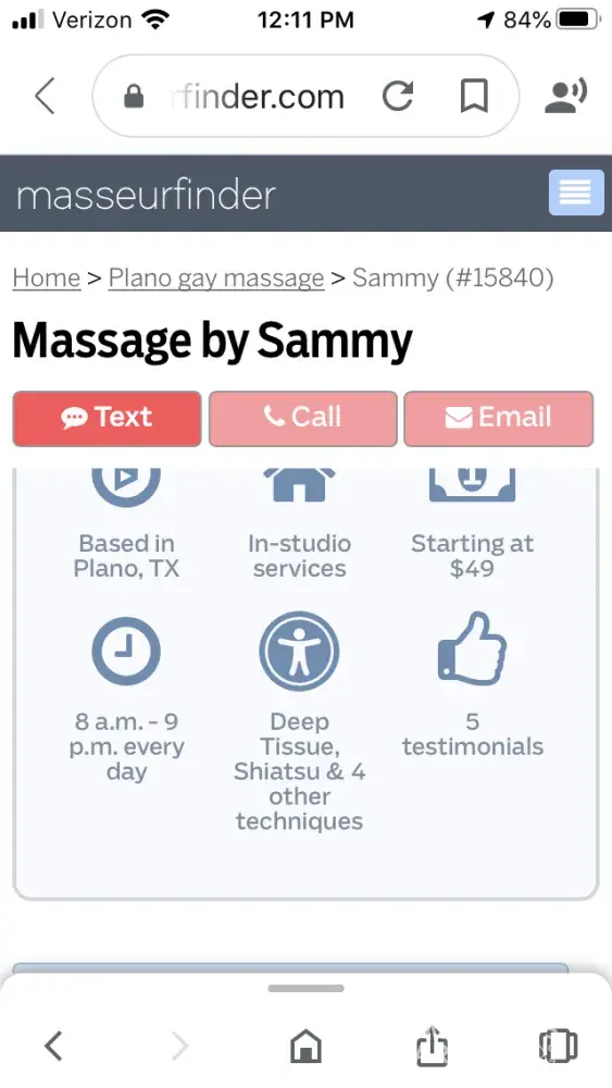 I am filing a formal complaint against Sammy from MasseurFinder. Sammy provides therapeutic massage out of his home in Plano. Upon arrival, Sammy seemed very unfriendly, rude, and felt that he was a racist. Sammy was not wearing any protective face mask and his home seemed very untidy and dirty. Someone needs to investigate this as soon as possible.