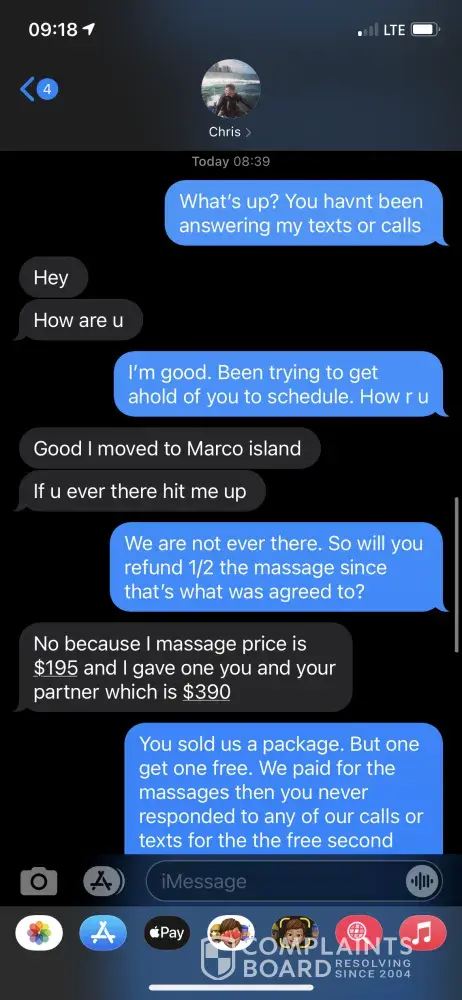 The above masseur offered a deal for BOGO 90 min massage get one free. He came to house and gave the first massage to me and my partner. We paid the $195 each and he told us to call him anytime to schedule the free one. A week or so later we tried Calling and texting and he never answered. This has gone on for several months. Now he has moved and will not honor the massages or return them money. Also his photos are not current and he is very misleading