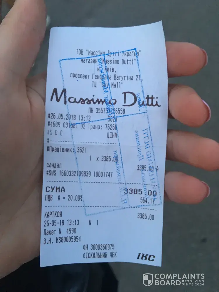 To begin with I had made the purchase of sandals and after wearing them twice the insole of the sandals slipped off and I decided to return it to the shop. So on 26.05.2018 the assistant recommended me to exchange it for another pair and assured me if it'd happen again I'd have the option to return it. I accepted that proposal and exchanged for a new pair of sandals. However the same story happened with these sandals and I had to return them. However today on 8.06.2018 I was disrespectfully refused to return the pair back. The manager of the shop Anna Borisivna gave such an argumentation - the guarantee of shop doesn't cover this type of defect. I was shocked. First time shop accepted it as defect and persuaded to exchange for the another pair, and second time the manager told that they are not responsible for it, that they are not able to do something about it. I was deeply disappointed and upset with this kind of service. Why it is stipulated in the police of the shop that there is a guarantee of 30 days for the goods, why it doesn't have any power in Kiev Massimo Dutti shop. Why managers are telling a lie to the client. Why managers are violating the law and consumer rights.