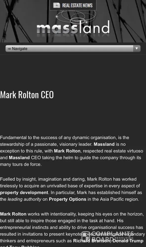 Mark Rolton’s Company is Massland.com.au Has No ASIC AFSL financial advisory dealers license - no real estate lincence, he also blatantly offers wealth advice - but disguises it as education- through books, useless rip off courses and webinars - like all the wealth gurus do. Fraudulent misrepresentation, false and misleading advertising, failing directors duties. Breaching [sic] corporates Act. Deceiving and lying to customers. Overpromising, false results statements, fake testimonials to lure customers. He tricks people to buy his dodgy, useless $5000 how to make millions course/ system that he promises will make you a property millionaire in one year or less - he makes his money from selling the expensive useless course/ system that he ripped off from the internet and he never delivers on his joint ventures.. front running customers to get better deals for himself.. the customers are left broke and disillusioned