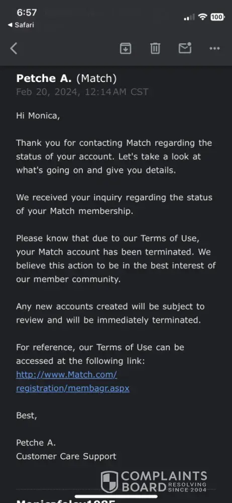 On 3/19/24, Match terminated my membership. Synopsis: A man on Match.com contacted me and gave me his full name in his message to me. Before I have a phone conversation with someone and definitely before I go out with them, I look them up on the PA Criminal Background Website - link: https://ujsportal.pacourts.us/CaseSearch - a FREE SERVICE offered through the PA Court system. I found he had an extensive record. I e-mailed him that the reason I wasn't interested was because he had a long criminal history and I cut and pasted ONE CHARGE of the many that were listed on him. He e-mailed back that what I did was ILLEGAL and he reported me to MATCH saying what I did was ILLEGAL. This is NOT illegal. It is a PUBLIC DATABASE. Match, without looking into it further, TERMIMATED MY MEMBERSHIP. The CRIMINAL's membership should have been terminated instead. After they terminated my membership, I reached out to Match and sent them the website and how to navigate it so they would see for themselves it is a LEGAL PA COURT SITE and they could SEE they have a person on Match with an extensive record-& even sent a screen shot. Nothing I did was ILLEGAL. Ironic that because I don't want to go out with a CRIMINAL, MY MEMBERSHIP is terminated and HIS no doubt continues... How fair is this? They also pointed out "one person complained about me in April 2023" - a year ago. lol. No detailed info of course. Guess anyone you don't go out or are not interested in with can report you and say anything even if untruthful (as it appears many of you HAVE experienced) and Match without investigating at all, terminates your membership. I am respectable person - a Piano Teacher with clearances for Child Abuse, PA Criminal background, and FBI Fingerprinting every 5 years which I renewed less than a year ago. But yet without Match investigating that it WAS a legal SITE, and HE DOES IN FACT have numerous charges in the past, TERMINATED "MY MEMBERSHIP" but probably let his continue. They need to INVESTIGATE before taking the word of someone - as the criminal website is open to the PUBLIC! I let the Better Business Bureau know and if no satisfaction, I will contact legal counsel. This is ABSURD!