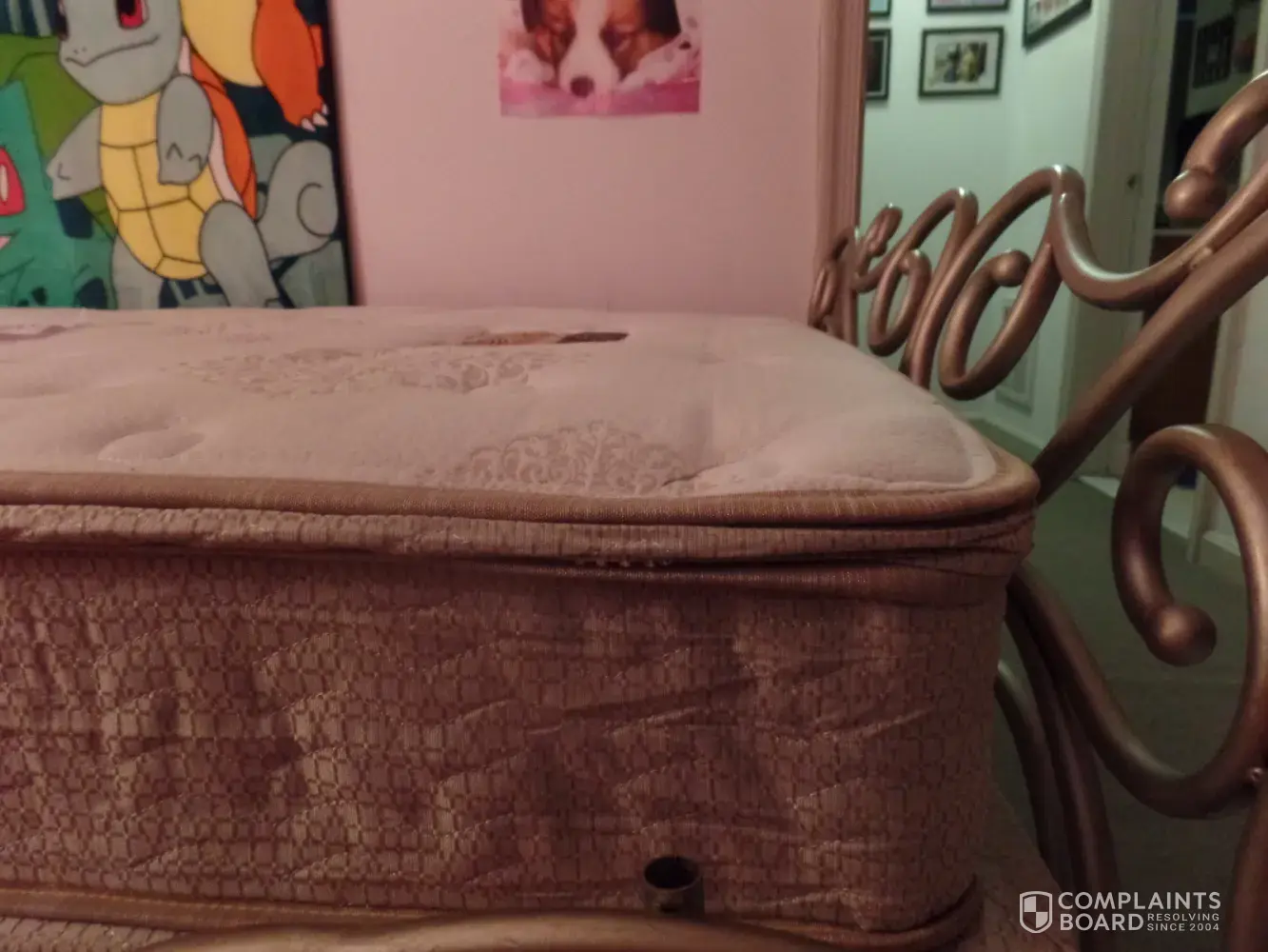 Next day mattress/box spring were delivered. They took her old which were in great shape just not a pillow top. After delivery men left we went up to re make the bed. To my horror the pillow top mattress was flat and no plush anywhere! The box spring was also making loud noises when our 115 pd daughter got on the bed.