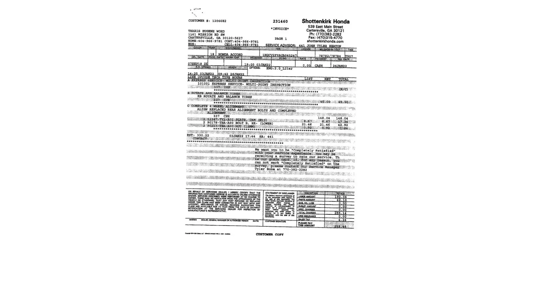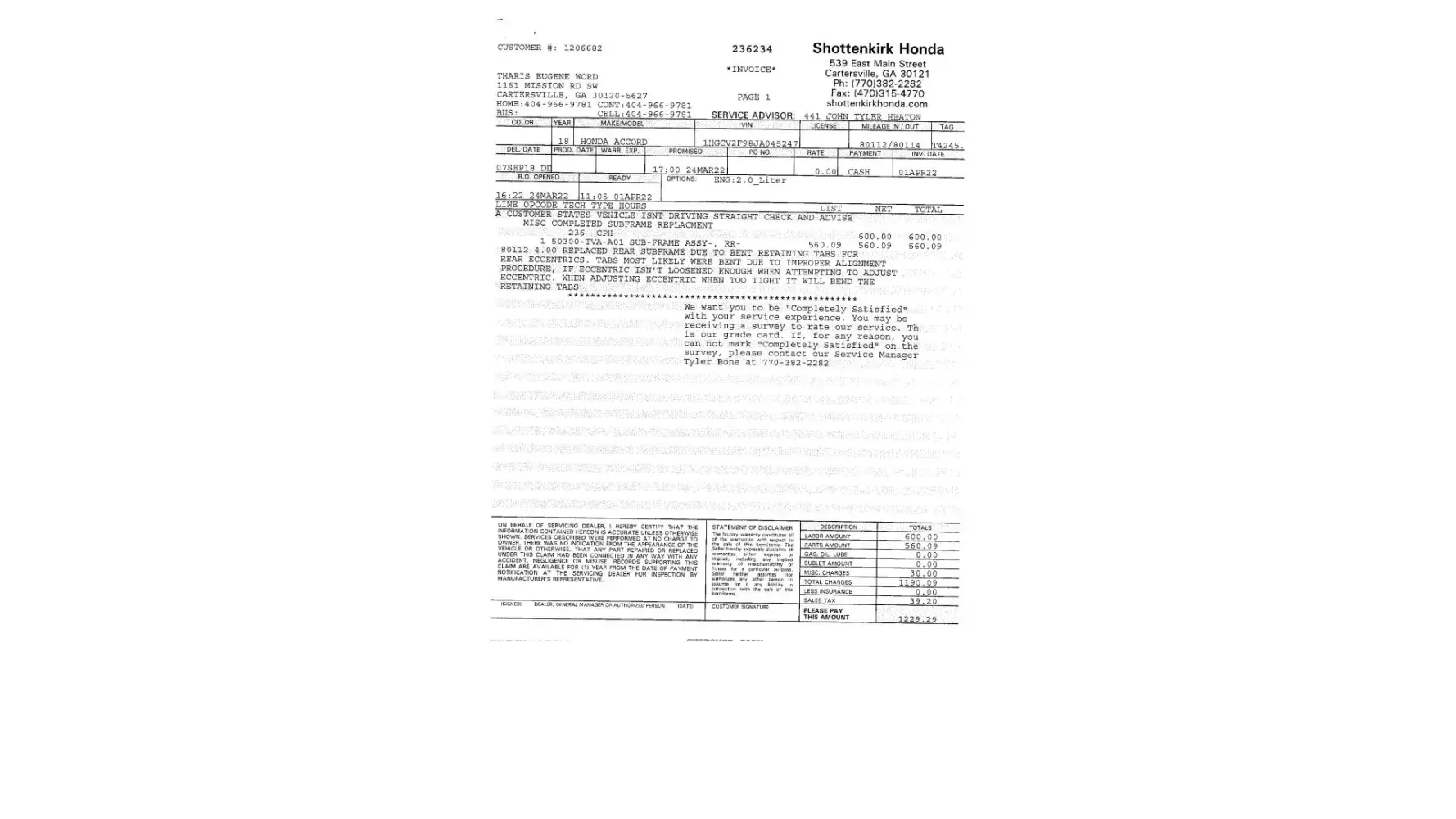 Attached is an email explaining what happened to my car. I have been talking to and emailing Mrs. Ebony Bell since February 2022. Nothing has been resolved. Brought my Honda in for an alignment and the technicians damaged the subframe retaining tabs and bolts. I paid for the repairs and was without transportation for a month.