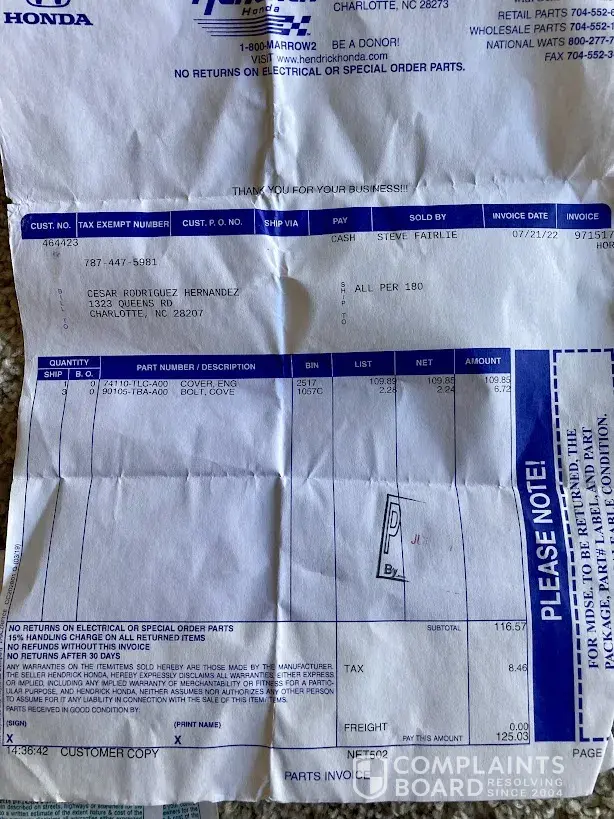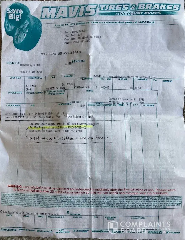 I did get an oil change at Mavis Dilworth NC on July 13,2022. Three days later, when I was driving my car on a highway in Ohio, suddenly, I heard a horrible sound. A passing driver alerted me that my car was dragging a metal plate that was scraping the road and causing sparks. Immediately, I stopped, looked under my car and saw a big metal plate/sheet thing just hanging off from the front end of it. It looks like it's the lower engine cover. Immediately, I drove to the nearest mechanic shop, where they managed to remove it. The mechanic told me that it is a common problem when someone inexperienced changes the oil in Honda cars, since they require certain extra care. He asserted Mavis was responsible for the incident, and urged me to go to Mavis so they take responsibility for the replacement and installation of the part. Something I did as soon as I got to Charlotte. And that Mavis Dilworth half did because, they still haven't paid me for the Lower Engine Cover that I had to buy on at the Honda dealer. Jim, Mavis' manager, placed the piece in my vehicle (although there are still some bumper clips to install), but he had no idea how to refund me the money. He agreed to call me, and, for two months, every time I contacted them, they told me that they had not received any authorization from Mavis' main office to reimburse me for that part.