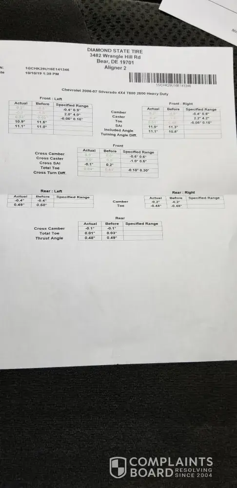 Read full complainttires, wheel alignment and balancing