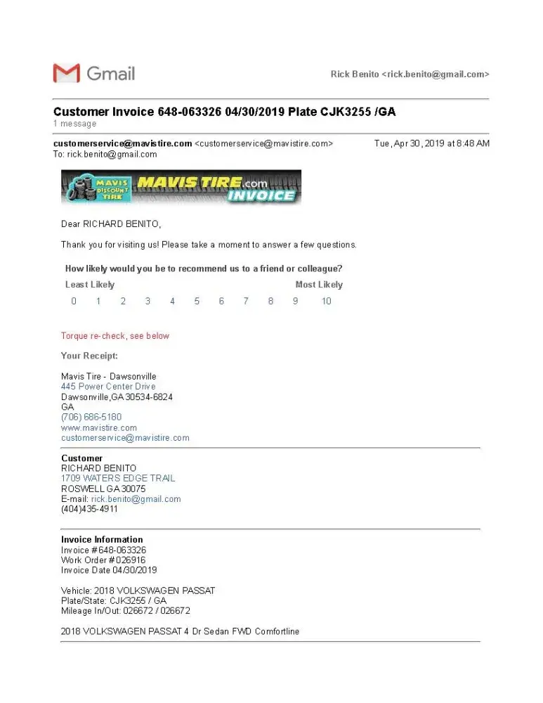 Shame on Mavis Discount Tire. It is 2019 and to charge women more for THE EXACT SAME THING is discrimination. Attached are 2 invoice for the exact same thing. The only difference is 1 was take in by my boyfriend and the other by me. i think it is shamefule that you would charge me more. Had my boyfriend not taken in my car for the exact same thing I would have never known.