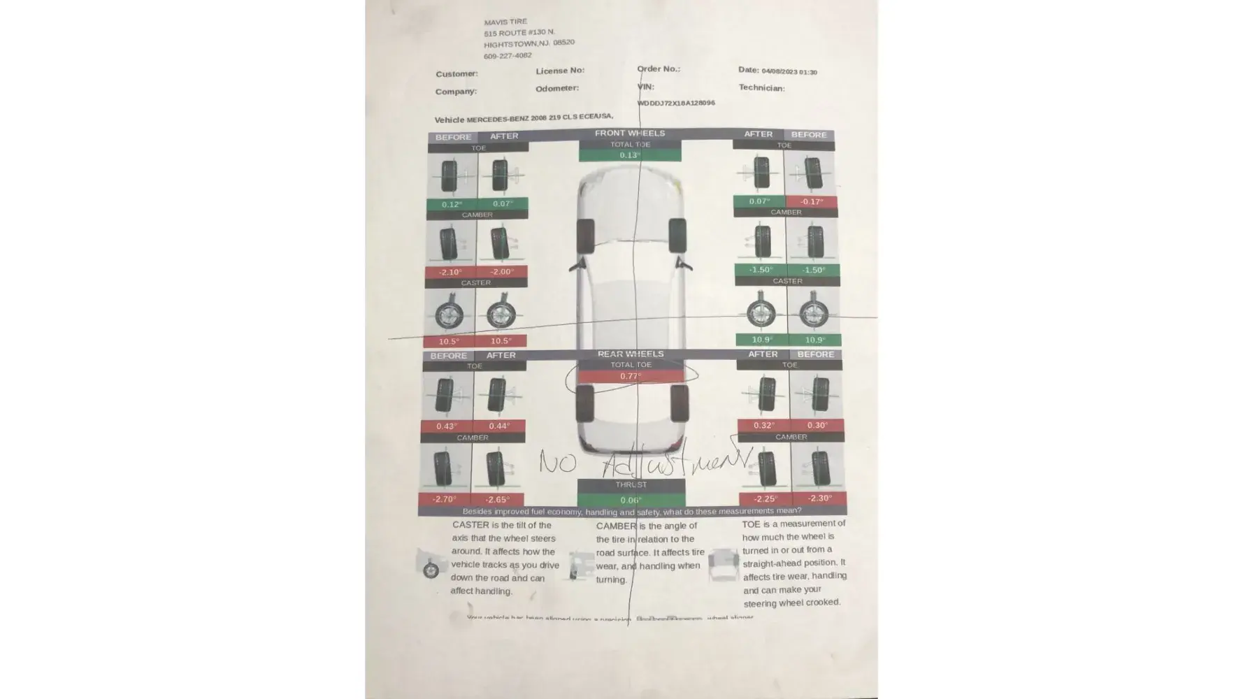 in April 8th 2023, I took my Mercedes CLS for Alignment. drop it off, and came back after an hour an half when they called me and informed me the job is done. there, the technician showed me the report and told me "WE COULDN'T GET THE JOB DONE". Told him why? said because "Manufacturer does not specify adjustments on this vehicle"!. didn't understand what does he mean. He then charged me and handed me the key. took the car for test and no improvement at all! nothing changed.