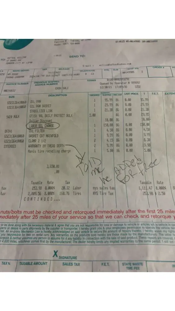 On Dec 30, 2021 I went to mavis, my 09 Grand Caravan needed a lot of work done. The big item was it needed a new Catalytic converter. I also requested the front quick strut assembly be replaced, a couple months earlier I did the rear shocks, and these parts were the original parts when it was bought brand new.. I wanted 2 new front tires, an alignment. It was also brought to my attention that the left front tie rod end needed replacing, which did not really shock me concidering over the summer I had to replace the passenger front. Then they told me that my oil pan had a hole in it, and needed to be replaced. After they finished, they told me that it was down to less than 1 quart of oil, even though no oil indicator light EVER came on, I checked my driveway no oil on concrete. Then recently I was going over everything that I had done with a buddy of mine, and MY EYES STARTED BURNING WITH ANGER. I was charged 3,650.01 for these repairs. As I was going over the invoice I started noticing some very SKETCHY, POSSIBLY CRIMINAL. Chech this out, R&R tie rod end, 2 of them price $150. R&R F STABLIZER BAR AND/OR BUSHINGS. No joke here I was charged for 2.5 of them @$95 each for a total $237.50. I was charged this (appears below the quick struts, if this is the labor for it explain this I was charged 3.2 units @$95 each for a total of $;304 dollars. The desk manager, I have to say is a good talker told me he was adding their extended warranty for free, I was charged $19.98 for that free item.. now in addition I had an oil change done, was charged $30 for 5 quarts of oil. Told them I wanted Full Synthetic, they put a low grade Blend. They did discount the oil by $10 bucks. But the line item below that a $150 oil change fee. They replaced the muffler that was replace last year. $163 for that and I explicitly told them to not put a resonator on I have one already, and I don’t want it on. Live in area where lots of hills and mountains driveways are very often built on incline and it scrapes as you backout I took off the other off. I added up what I authorized/ agreed to I should have been charged 2,497, I was charged for real sketchy items. And in several areas on this invoice I was charged for parts and repairs that were not done, to the Tune of $1,100. I have used Mavis numerous times in the past never had any issues, only used this location once a couple years ago, to Get NYS inspection because the one that I always go to can’t do them. And this time they were busy and could not do it for another few days. And they said they do not do Catalytic converter changes. I went to another location, to see if they could at least get the tires, and Quick struts done. Was telling him all that was needed to be done, he said he could do all of it in 3 hours. I was talking to a tech and let slip that he gets very little commission on most work but a much bigger commission on invoices over $3 000. I believe that a lot of very nefarious actions took place in this shop. It really does seem that Mavis’s representatives stole $1100 from me.