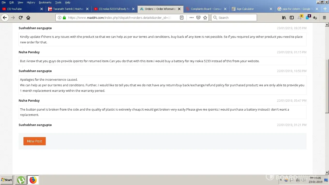 I have purchased the nokia 5233 full body housing on 19/01/2018.My order is 1505717 They have sent me a very cheap quality housing.The quality is so bad that body housing will not even last for an year and the button panel, one of the clips of the button and one of the hooks of the body is broken.Now when i asked for a refund they told me that refund is not possible.I even told them that please give me refund in your wallet i will instead buy a battery.But they are not even willing to give me anything.Please help me out.