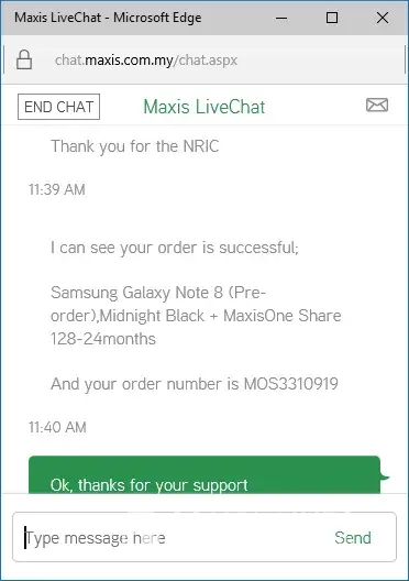 After ordered, I was using Maxis Live Chat to double confirm my purchase order and Maxis operator did reply me order was successfully with an Order ID.