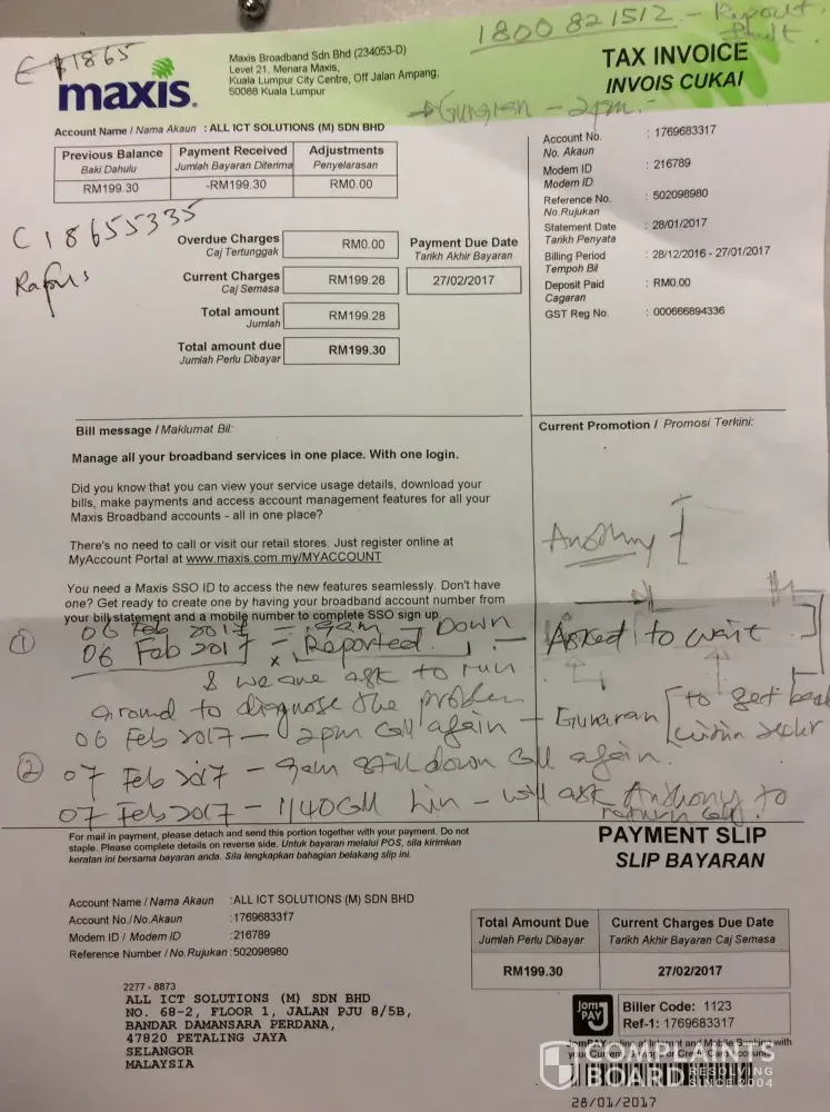 Company name All ICT solutions (M) SB, maxis broadband internet connection was discovered down on 06 Feb 2017 8.30am, trying to reset and restart a few times but no result. Called up Maxis service center at about 10am, was asked to go round on and off but no results as well. Asked to wait for the technical support to call back with 2 hrs. No one called till 2pm called [protected], called gunalan...he said will get TM to come in by tomorrow morning.
