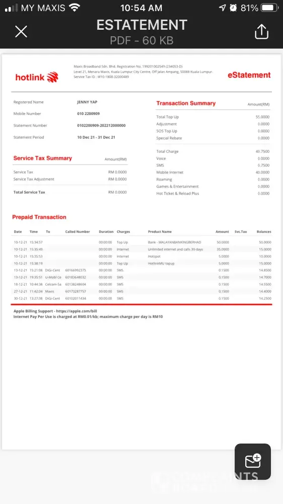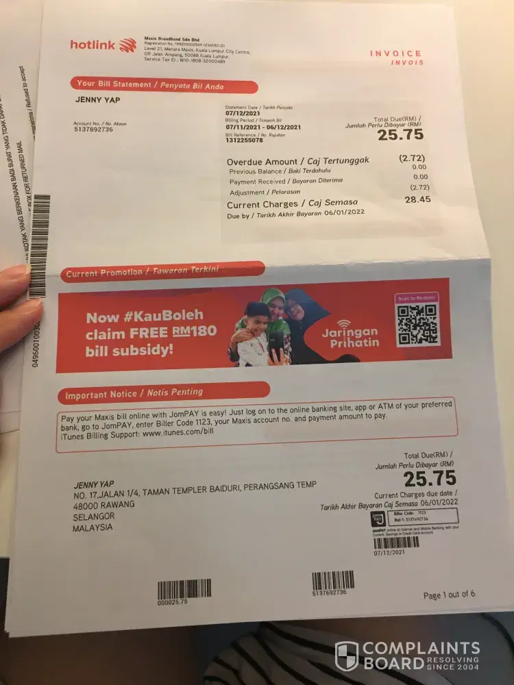 • I have lodged in a complaint to Maxis on 5th of March and Maxis informed that they will revert within 48 hours, and I can exclude that RM243.60 when I make payment to my bills, but it was never resolved until Today 26th of March when I am writing this complaint.