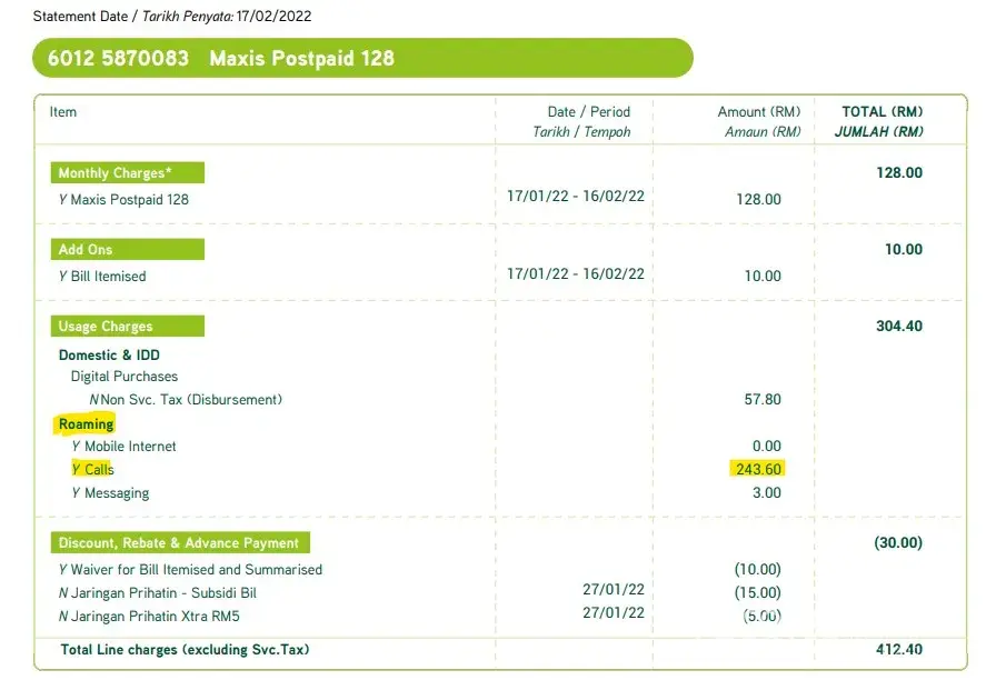 • After returning to Malaysia, I was shocked after receiving the maxis bill of RM700+ with an additional call charge of RM243.60 for “International Roaming†which I never received any incoming calls so.