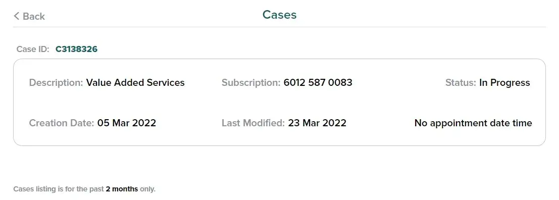 Saya telah membuat panggilan ke customer service untuk report mengenai status Wifi (Maxis fibre) saya yang tiada signal. Saya dimaklumkan tindakan akan diambil segera untuk menghantar teknisyen supaya dapat menyelesaikan masalah saya.