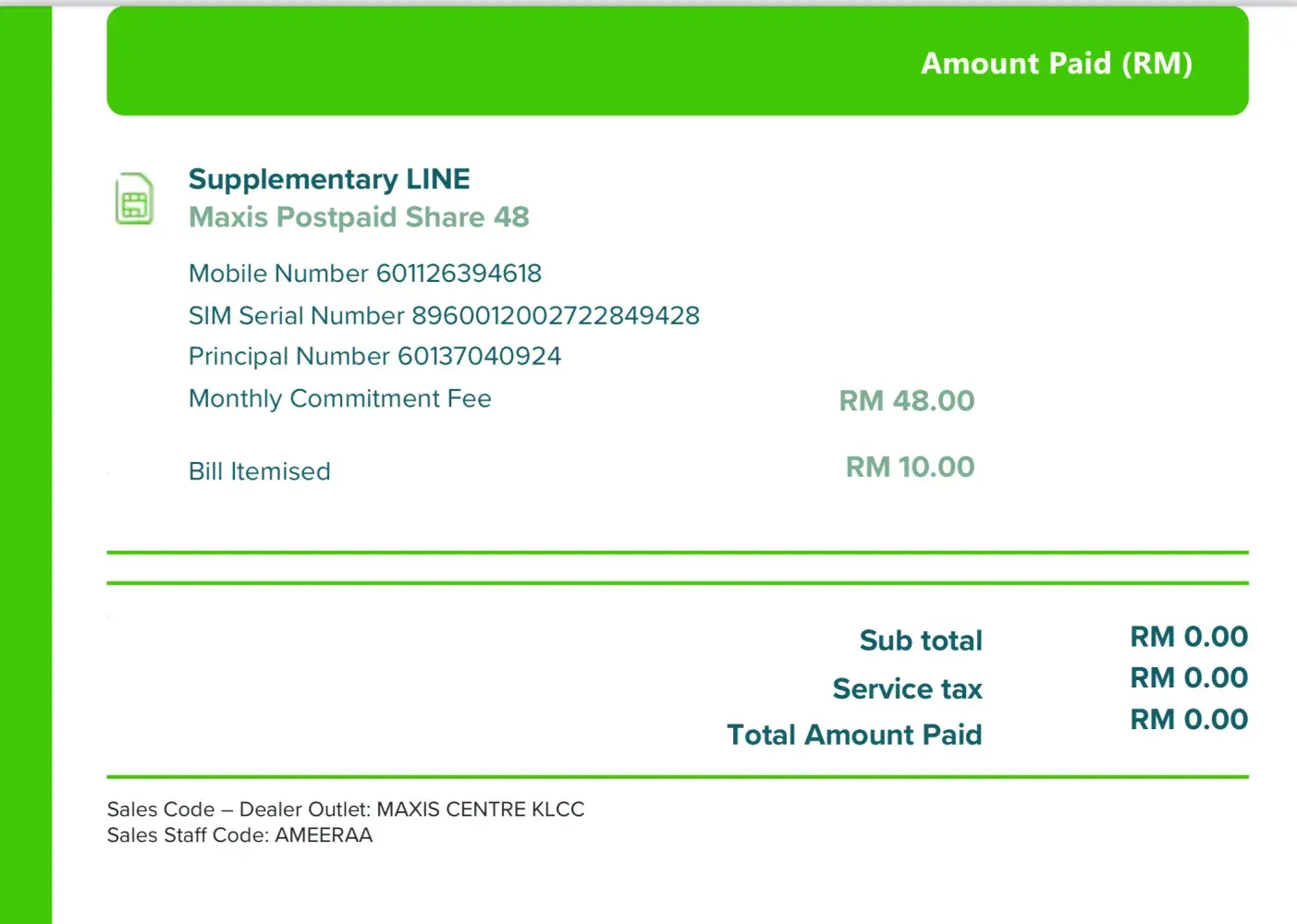 04/11/20, 18:57, Ticket No.4079 - I went to Maxis Centre Klcc to inquiry about device plan with them. One of the sales staff had advise about current promotion which is RM1 Year End Sales instead of Zerolution Plan(as per our interested). She briefed a procedure and what i need to take action. First of all, i need to add-on a supplementary line and upgrade to Plan128 and i need to pay upfront payment which is RM594. After do all the cross checking and everything, I agreed with the all idea and advise given. I had settled add-on the supplementary line on that day, she told me that, after the process effective, so i need to come back to Maxis Centre and do upgrading on the principal line to the Plan128. Then, everything will be entitled. She also had been reserved the device Vivo V20 Pro as per my intention. The Sales Staff Code: AMEERAA