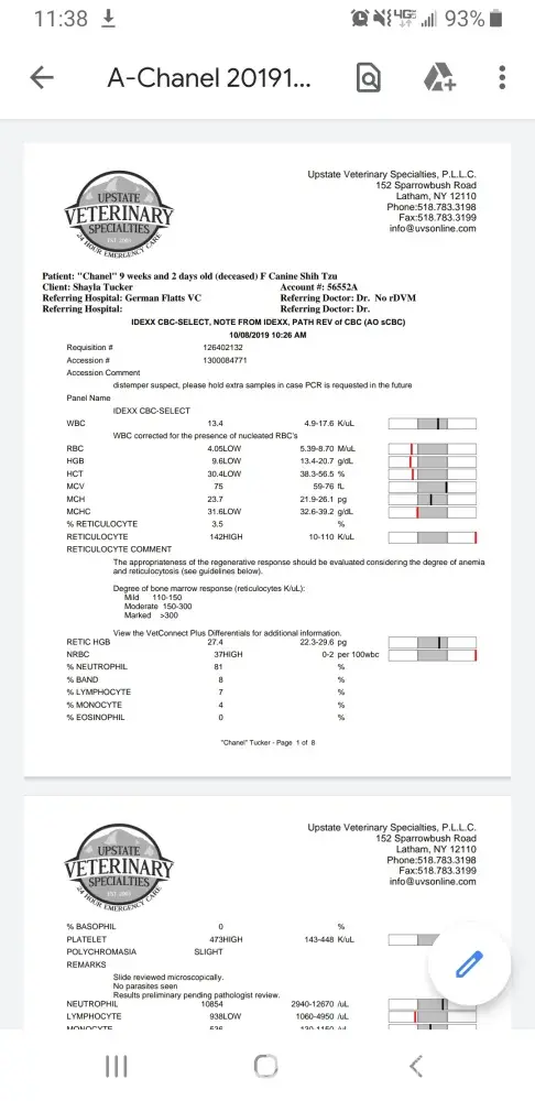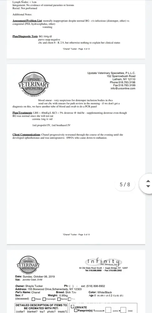 Robins puppy was born defective. As per Robin's own veterinarian, the puppy I purchased had an open fontanel as of Sept 25 2019. Documentation was provided to me. While this isnt always life threatening or serious, it can also become deadly. I have attached screenshots of things that can happen to a puppy with an open fontanel. The puppy purchased did MANY of those exact things prior to her death. My own veterinarian report states they actually suspected hydrocephalus, which is a condition seen in puppies with an open fontanel. If you look at the bottom right corner of Robins own vet report, you will see the info about the open fontanel. Robin also provided me written information about this condition and told me not to worry. Clearly she was mistaken. If you look at the vet reports I previously provided, you can specifically see where congenital hydrocephalus was suspected. None of this matters to Robin though