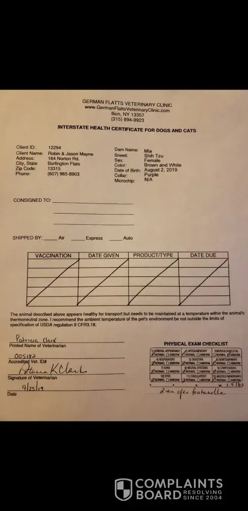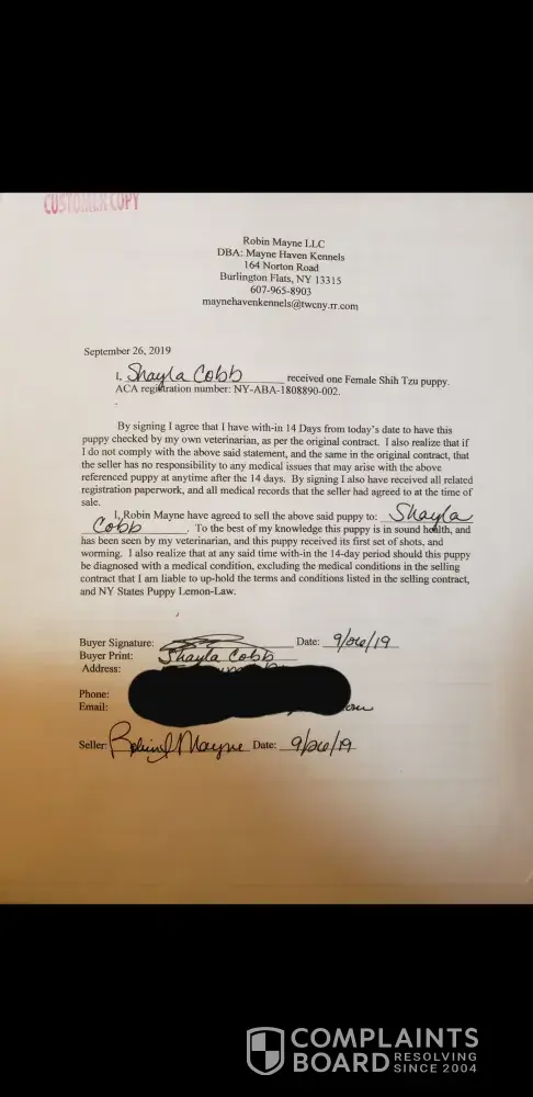 On Sept 26, 2019 I purchased a shih tzu puppy from Robin Mayne with Mayne Haven Kennels. Robin provided documentation for health guarantee, NYS puppy lemon law, etc. The evening of Oct 4 2019, I noticed my puppy acting a little bit lethargic, and she began vomiting. By mid morning of October 6th 2019, the puppy was almost comatose. I informed the breeder, then rushed the puppy to an emergency vet. Now, I do have all conversations available in writing, as it took place via Facebook Messenger. I informed the breeder, Robin Mayne, my puppy was ill. She was lethargic, vomiting, and showed serious neurological problems. The puppy was rushed to an emergency vet, as it was a Sunday. The puppy was hospitalized, but euthanized later that evening as she was too far gone. The breeder insisted I have my vet send her vet all pertinent records for review, which was done. I VERY politely asked for my entitled by law refund for the cost of the puppy, as well as the $1000 vet bill. Robin REFUSES to acknowledge the puppy was ill or take any responsibility for selling a sick puppy. She proceeded to tell me to take her to court. As per NYS Puppy Lemon Law, Robin OWES me a full refund for the purchase price of the puppy AND my vet costs. ($702 for the puppy, $1000 in vet costs) Still she refuses to be reasonable. I have filed a complain with the NYS Attorney General.Desired Resolution:Â RefundDesired Outcome