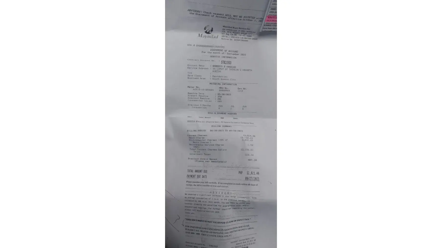 Good morning, I wanted to file a complaint to maynilad as they have charge us an excessive amount of bill, no one is residing on the property and there are no leaks in the property and was just recently started a renovation on august 29, 2023. their last reading they provided us for the month of July was anomalous since there is no present Reading on the bill and when they handed us the bill for September we are shocked to find out that our bill has gone up from 135 pesos to 12,000 and where would we put that amount of water that has been used? The inspector even visited the premise and didn't bother to listen to our complaint and said that that was the water meter reading is and it is accurate. Please advise and see the attachment of the reading and bill. I'm hoping that we can resolve this as soon as possible because my father is too old to handle this kind of thing.