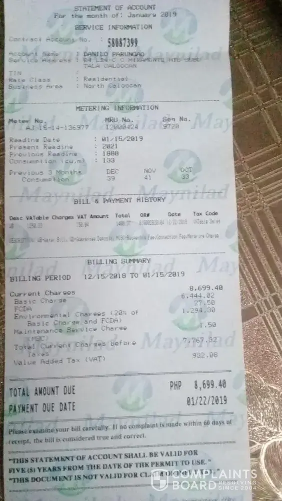 Maganda po ang pag babayad namin sa inyo at hindi po kami nag kukulang pero bakit ganito para naman hindi makatao itong bill na tangap namin Jan 2018 1, 400.37 tapos itong Jan 2019 8, 699.48 para naman na kalahating taon na ang pinababayad ninyo sa amin 6X payments po ng na recived namin ang natangap namin eh" wala naman na bago sa pag gamit namin ng tubig masnagtitipad pa nga kami tapos ito ang ma-received namin na bill. Grabe natin ito kahit kayo po ang makatangap magagalit ka sa natangap na bayarin. Paano na lang ito sino po ba ang dapat kausapin dito at ilalagay ko ito sa social media ng makita nila bakit ganito ang naging bill ko.