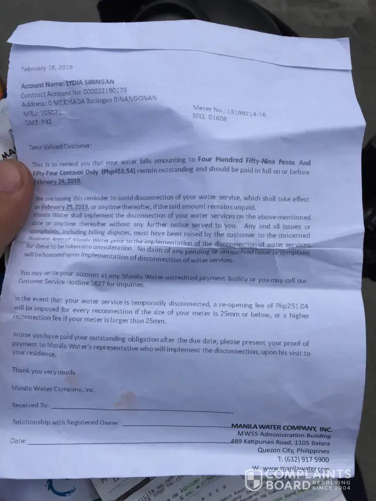 I would like to get the attention of your office regarding the inconsiderate contractors under your company. The duo went on cutting our water connection without informing us - the owner. As per our tenant who are residing at that time on our house, they disagree and did not sign on the paper that your contractor is asking to get our water meter. Still, they fake the signature and remove the water meter. This caused us havoc and been emotionally and physically violated due to a no-water condition of our tenants back then. This happened almost a year now! And until now there is no update regarding our formal complaint filed 7 months ago!