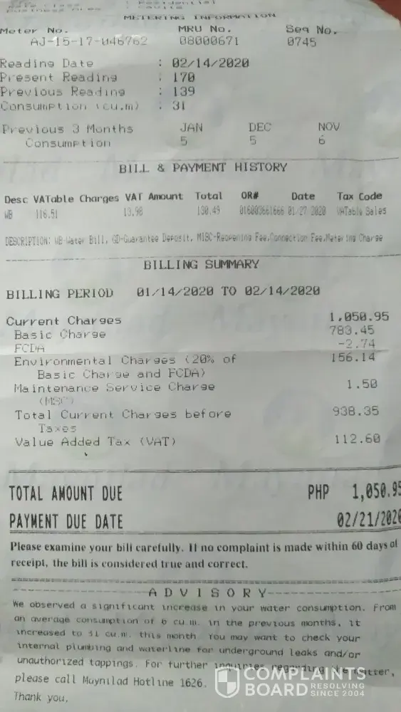 My usual monthly bill charge is only 130.68php, always the minimum amount, always paid on time. Got February bill and was disappointed as it went up to 1, 050.95php. I dont have any household appliance that could use water, always did my laundry at the laundromat place. I'm the only user at my apartment at nasa work ako 10hrs a day. Guy that works for maynilad can only say "tama yung reading, valid yung bill". Also consulted with landlord and said walang leaks sa mga tubo, though the water is muddy in the early morning this past month. I found out all of us renters in the building has the same excessive billing this month. Your employee can't even explain what specific day nag spike yung water usage, from 6 cu.m. usage to 31 cu.m., with no good reason, only answers "tama yung reading", very incompetent service. I doubt tama yung reading at baka may illegal tapping pa. Please resolve this issue, halos 10x ang increase ng bill this month for only one residential rate class user. This is daylight robbery.