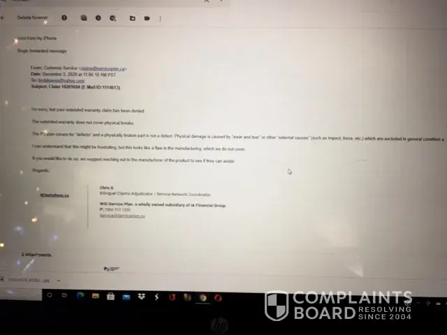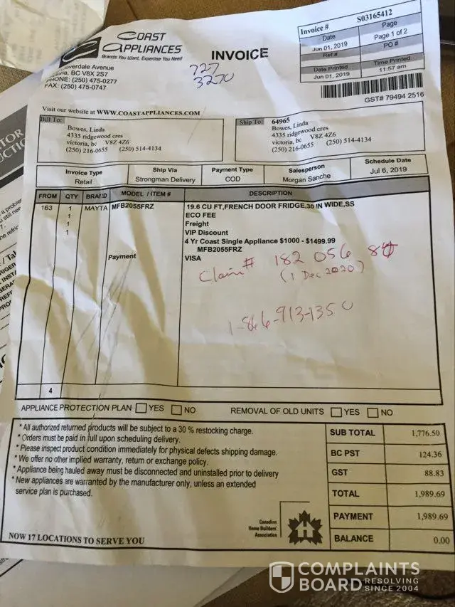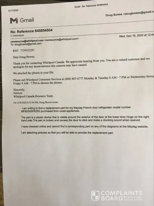 She indicated that she couldn't see the image directly but gave me a email address and they would attach it to my file. letter attached. She also suggested that I might have better off if I had purchased a Maytag protection plan instead of the Coast appliances one but didn't definitely know if it would have covered the part that was defective.