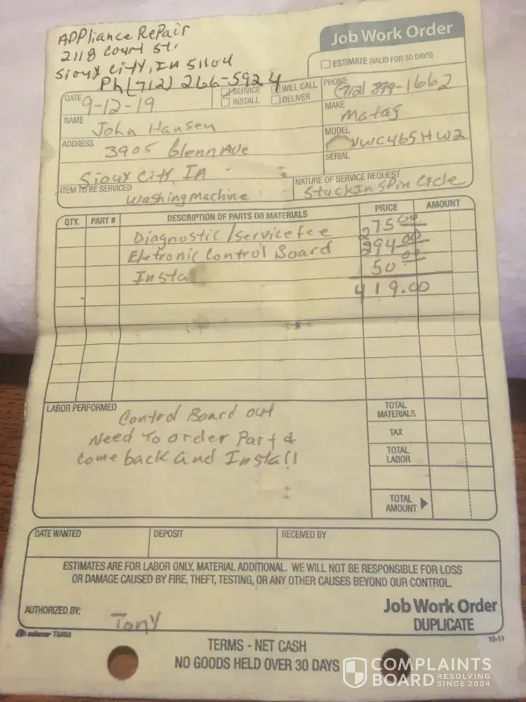 Washer went into spin cycle and would not stop. Contacted repair number and was told someone would be out. Date and time came and nobody arrived. Could not wait being lied to again so had another repair service fix the problem. Maytag won't honor warranty and pay for repair since it was not done by them even though they lied about a service appointment which I found out was never made.