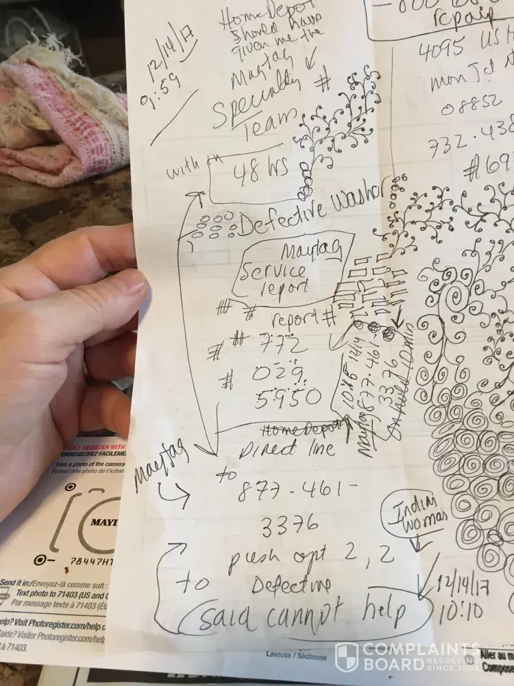 Made all pertinent calls to Home Depot and Maytag. Each company blames the other. I am still without a washer that works. It is 8 weeks old!