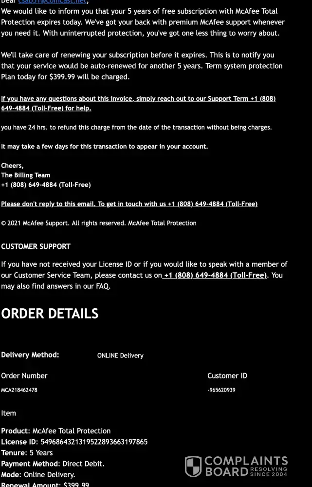 I have received unexpected renewal for McAfee® Total Protection - 5 Devices in US dollar price AUD $156.65.