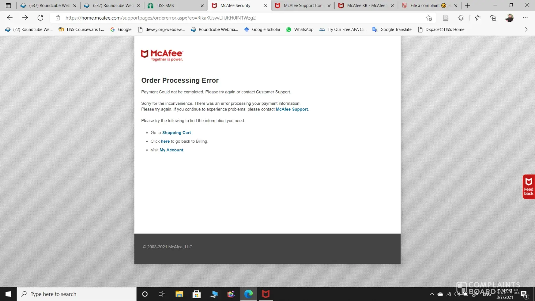 Desired outcome: for Mcafee to sort out the problem it has caused me