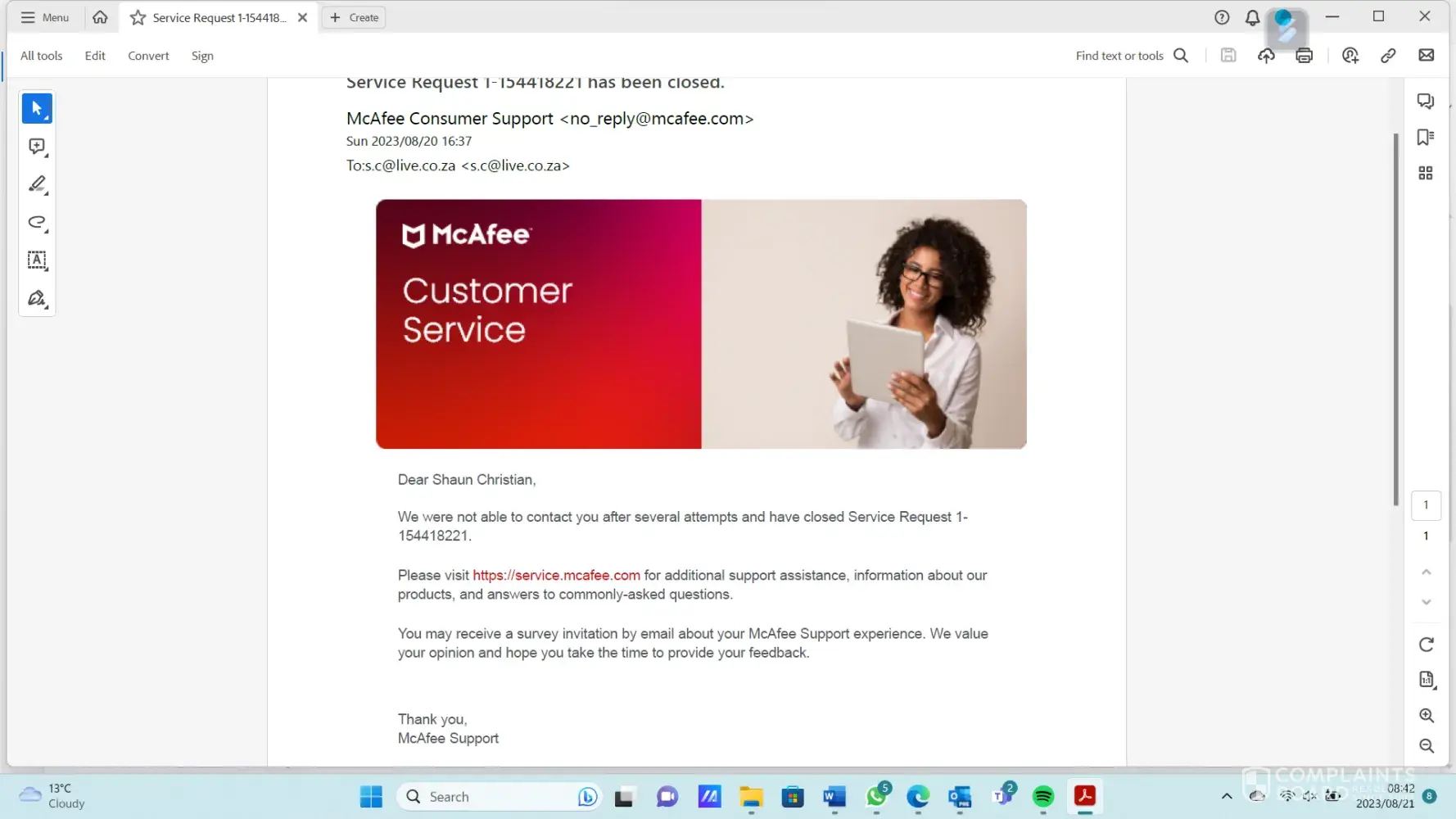 On 22 June 2023 I received email - "URGENT UPDATE" Your Computer May Be At Risk, Renew McAfee Antivirus Delivery [protected] - Your McAfee subscription expires today!