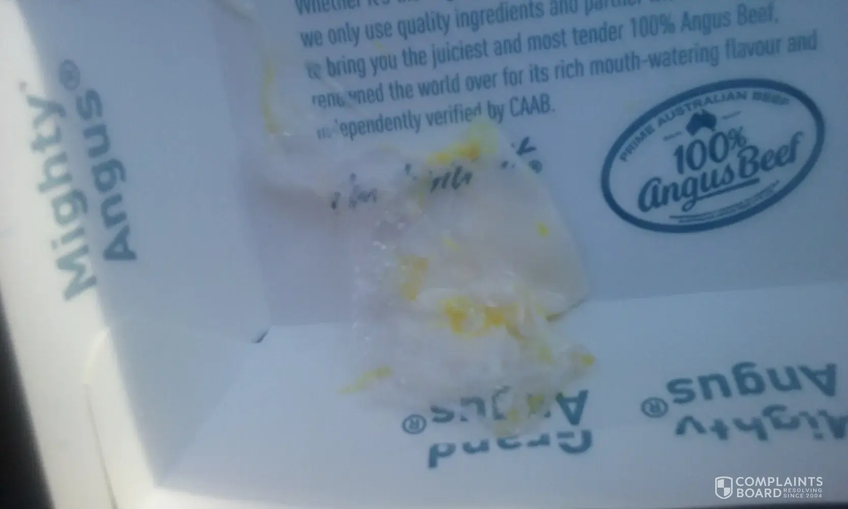 On friday the 12th of june I went through the drivethrough at tuggeranong McDonalds. I ordered 2 medium grand angus meals and a happy meal. When I received the meal I went to a car park to eat it before I went on my way (I was in a rush hence why going through drive through) when I opened my (cold) grand angus burger to take the pickles out (lucky I do this for the following reason) to my ddisgust I found a piece of cling wrap looking plastic in there. My sisters burger was also cold and so were our chips resulting in chucking our meals out and wasting $20+ and leaving hungry and disgusted.