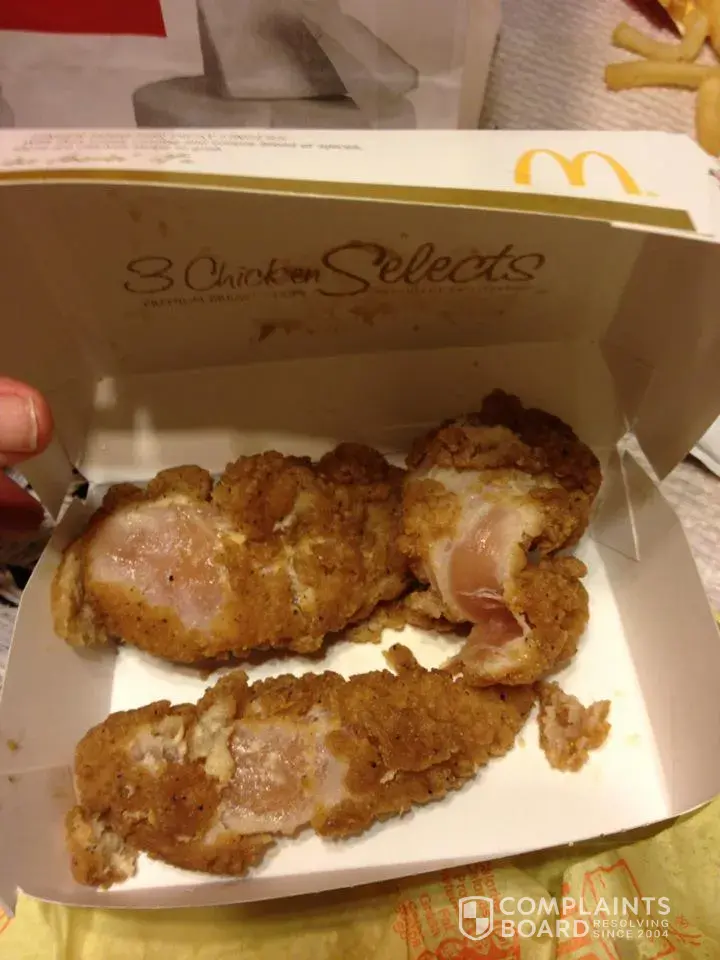Went to Mcdonald's order 2 Big mac's for wife and I. order chicken for my son. Got home, Open the chicken.. It was Raw. See photo. I called them up spoke to some lady. See was mexican and stated she she didn't understand me and hung up on me.