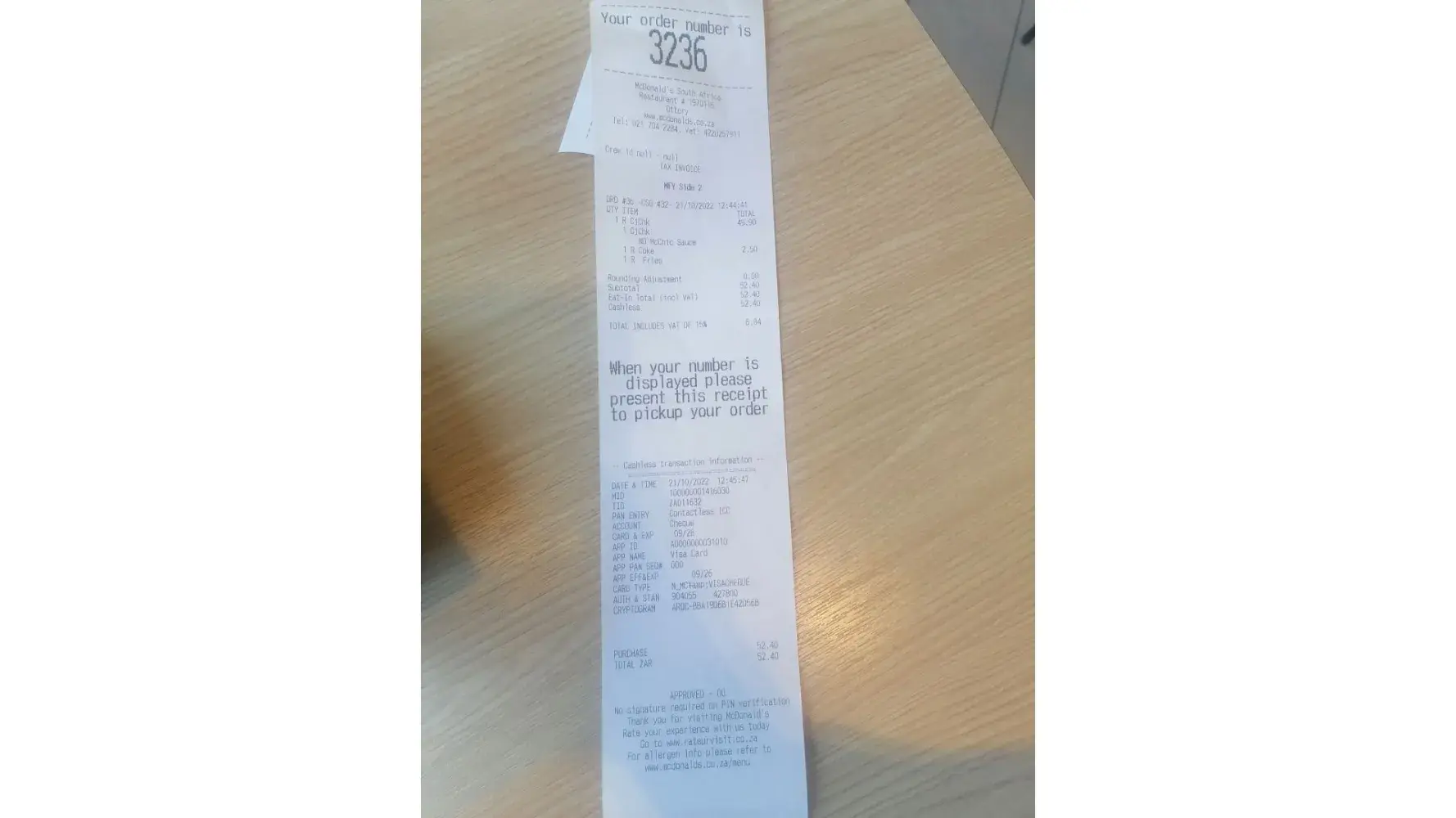 On 05 October 2022, I ordered a Low GI chicken Roll/ sandwich at the Mcdonalds McCafe Menlyn Retail, Pretoria through drive through.