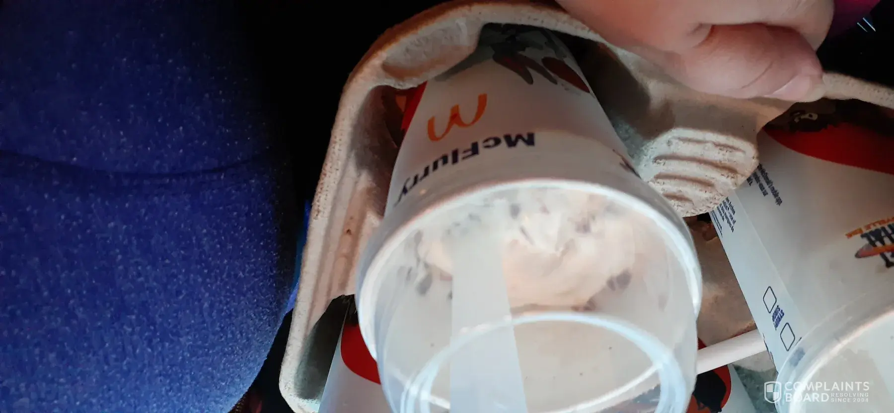 We go to mcdonalds many times during the week, and many times we get mcflurry s, this time we got 4 mcflurry's sept 5th., we were moving so went to get those 4 treats which we buy often .was very dissapointed, the cups were like half full .I did take a picture .we were too busy to just go back at the teller and too many cars...so took some pictures instead to make a complain ..we often get a mcflurry and this is the first time this happens .would like to have 4 more especially for the price I paid for the 4 mediums .thanks ...
