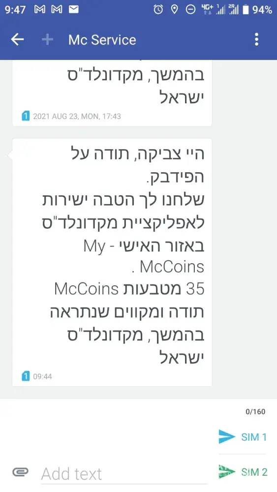 We applied to McDonald's customer service in Israel and they replied a day after with a notice of a gift of 35 McCoins, which was very offensive to the fact that I stayed hungry that day because I couldn't even touch that so called burger I received.