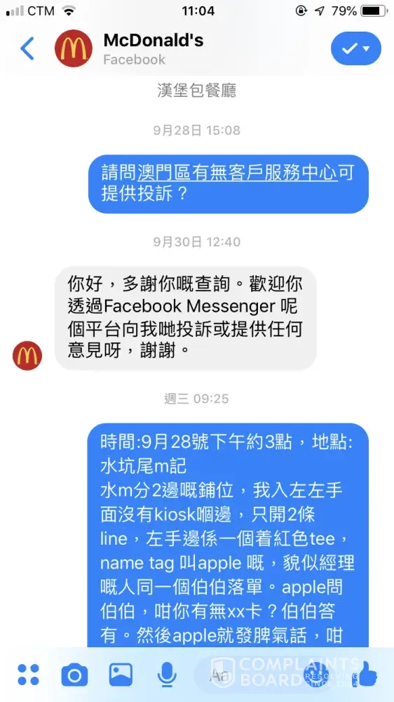 I've sent a complaint letter in Chinese via FB messenger to the service team from McDonald's Macau. However I know they've already have a look on my complaints, but they did not reply me after a day. I hope this complaints-board can give me a response, otherwise I will have further action against this case.