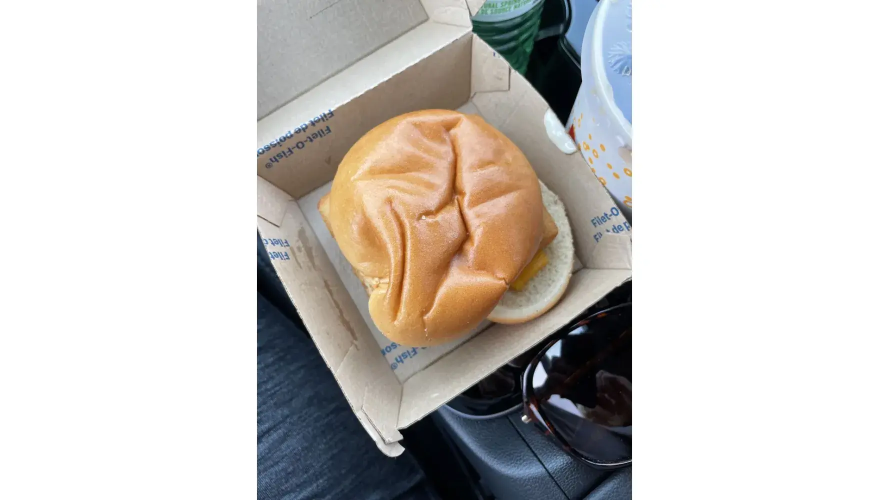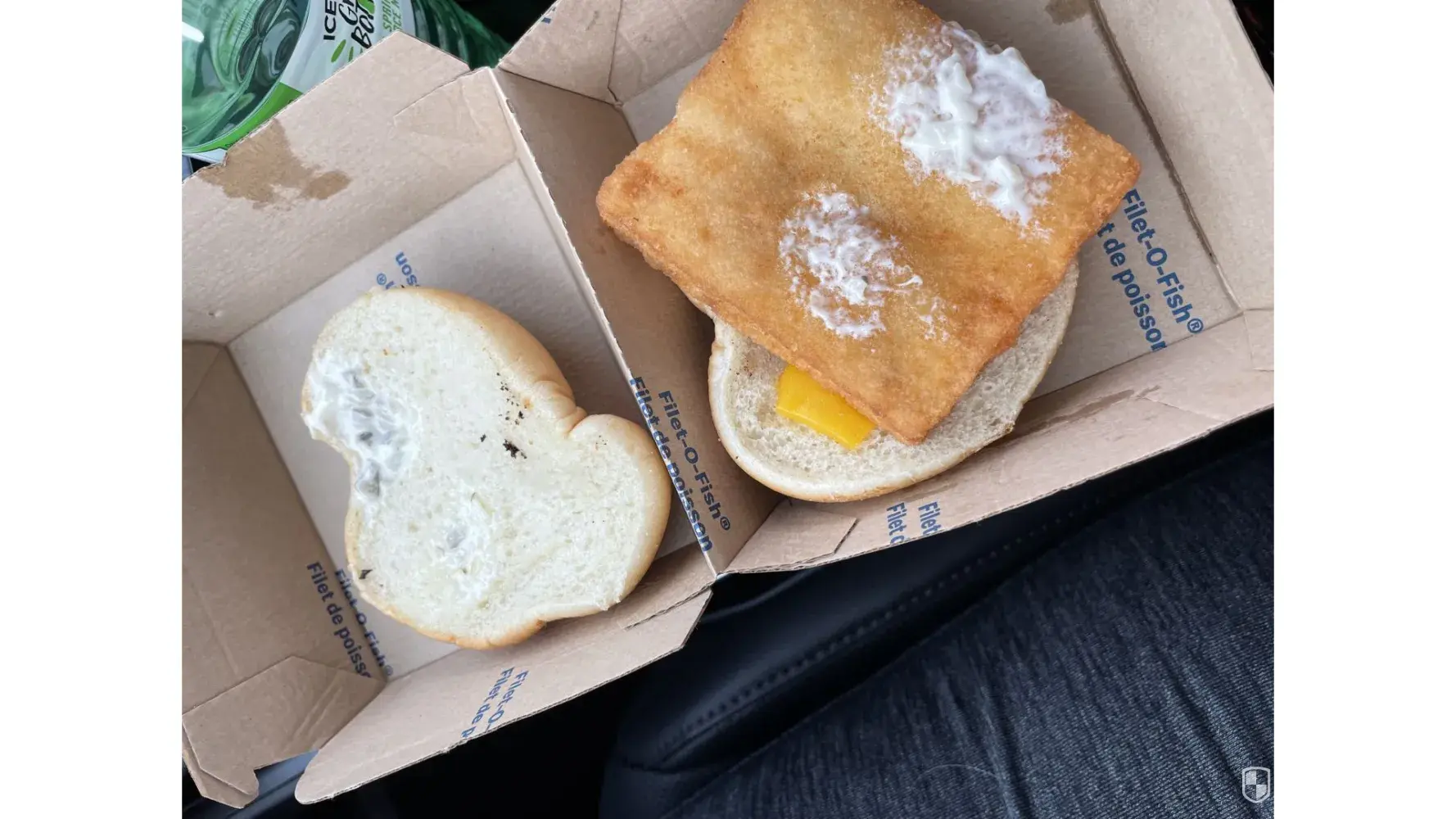 I ordered a Fish Fillet to go so I could eat in the car. Once in the car I opened my sandwich and was so disappointed. I have a picture Below.