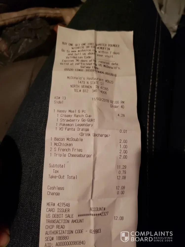 I was at North Vernon Indiana's McDonalds last night. All of our food was very cold and my sons chicken nuggets still felt frozen. I tried calling the store a total of 38 times (I have the screenshot of it) and not once did I get an answer. Their lobby is currently being remodeled and the drive thru was slammed. I did not have time to sit in drive thru for another almost 20 minutes. I'm not very happy with the situation. I have included the picture of my receipt and of the amount of times I called. I can be reached via email [protected]@gmail.com or by phone [protected]