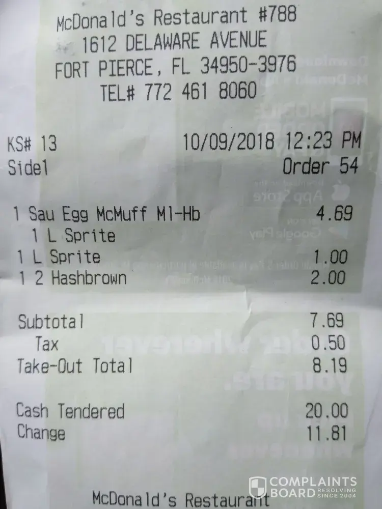 I just tried to order from your location at 1612 Delaware Ave in Fort Pierce FL.. I place my order at 12:23pm for a sau egg McMuffin ml-hb an extra two hash brown and two sprites.. I sat in your 2nd waiting spot for 15 to 20 for my order they didn't even make by the time I got out my car to go check on my order.. I watch several cars leave out the drive thru as I was still parked waiting.. I asked my refund to be giving a coupon for a free sandwich with the next purchase which I didn't accept.. I feel as if your manager could have done more to satisfy me.. You always should do whatever you could to make you customer come back to visit.. in my case that wasn't going to cut it when I have a 9month pregnant women in the car with me...